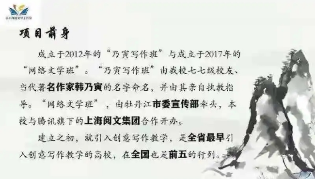 安博在线平台“乃寅写作班”创立于2012年9月。以中文系77级荣誉校友、当代著名作家韩乃寅名字命名,并由其亲自执教指导。“乃寅写作班”旨在使学生深入了解创意写作规律,结合写作训练,提高学生自我发现、自我认识、自我反思、自我提升的能力,实现高等教育使学生全面发展的培养目标。为学生在文化创意、影视制作等文化产业部门就业提供写作技能支持。自成立以来,共培养学生100余人,出版长篇小说9部,在国内报刊发表文学作品100余篇,12名同学成为省、市作家协会会员。
