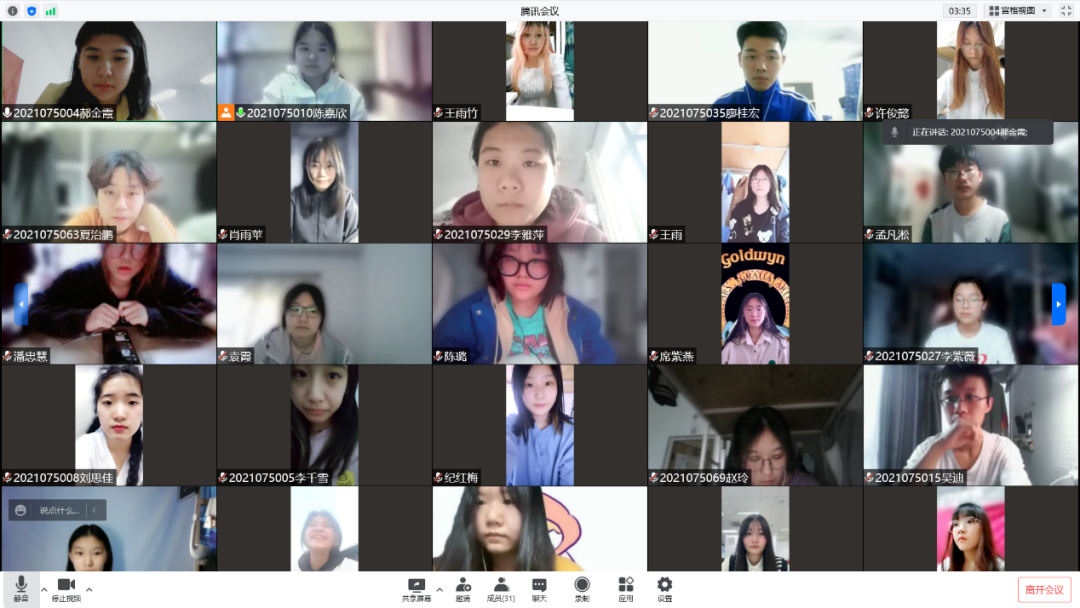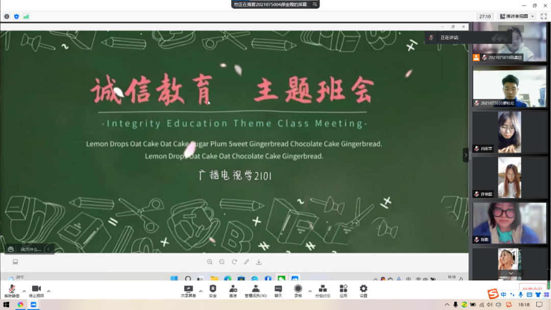 为全⾯贯彻党的教育⽅针,切实加强大学⽣良好的公民道德意识和道德情操,弘扬中华民族的传统美德,促进学⽣全⾯发展,21级广电一班于5月3日通过腾讯会议开展了“诚实守信,知恩感恩”主题班会,班级全体同学参与本次班会。