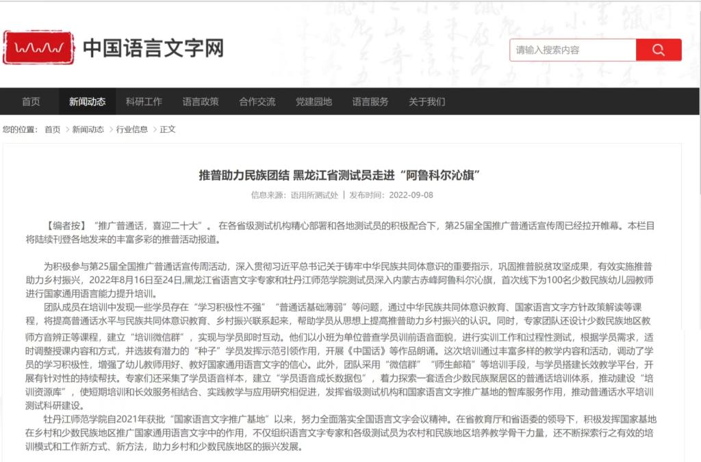 2022年8月16日至24日,黑龙江省语言文字专家和牡丹江师范学院测试员深入内蒙古赤峰阿鲁科尔沁旗,首次线下为100名少数民族幼儿园教师进行国家通用语言能力提升培训。此次活动得到了中国语言文字网的报道。