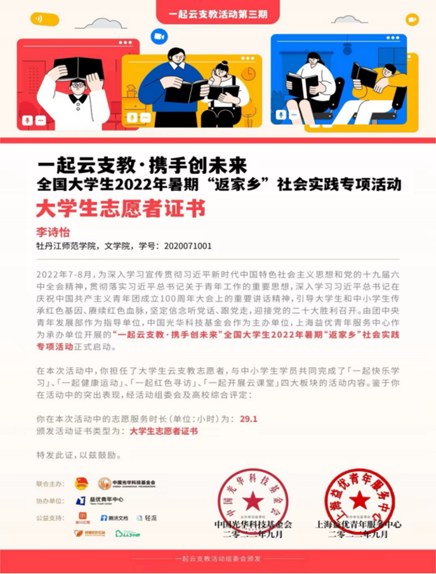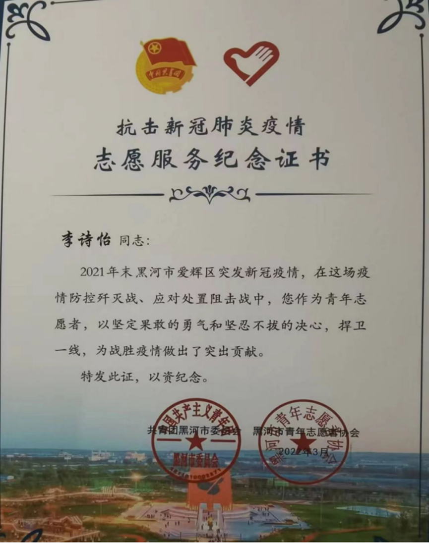 社会将我培养到了大学,我也要将善意回报给社会。在2020-2022年,我曾多次参加社会志愿服务活动,如云支教、“三下乡”乡村推普振兴活动等,在疫情期间,我作为防疫志愿者多次参加核酸检测、物资运输以及信息录入等工作,志愿服务时长300余小时。被需要是一种幸福,志愿服务活动既是“助人”,亦是“自助”。赠人玫瑰,手有余香,在服务的过程中,我不仅帮助了别人,同时也实现了自我能力的提升。志愿服务在心间,为人民服务在路上。