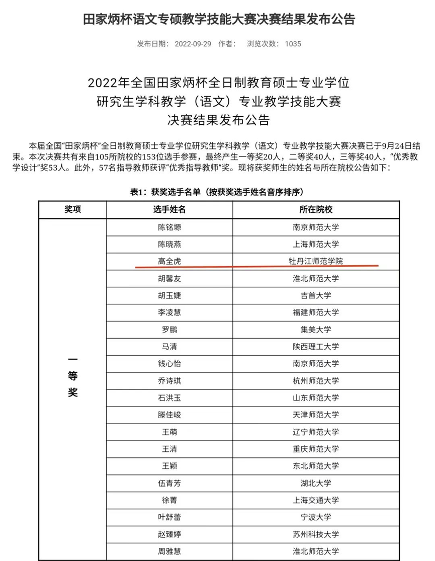 9月24日,2022年全国“田家炳杯”全日制教育硕士专业学位研究生学科教学(语文)专业教学技能大赛决赛正式落下帷幕,我院硕士研究生高全虎喜获一等奖,曲竟玮老师获优秀指导教师奖。