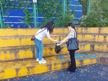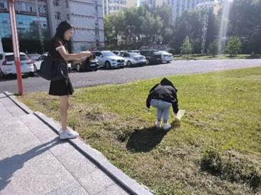 研究生党支部则自发组织部员分散到校园各处进行卫生清扫活动,以实际行动贯彻“一步,一捡,一扫”精神。他们有条不紊,干劲十足:对室外场地、草坪绿化带中的垃圾进行清理,并在有序的分工配合下,将拾捡起的大小垃圾装进黑色垃圾塑料袋一并处理,还草坪以洁净,回校园以整洁。