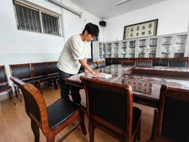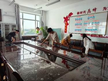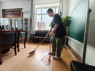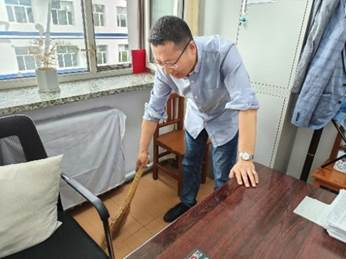 在老师的带领下,志愿者们分工明确,各司其职,认真负责地参与到卫生打扫中,手拿垃圾袋、扫把、抹布等工具,一丝不苟地清洁每一间办公室,每一块公共区域。