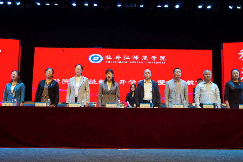 第六项全体教师代表为2023级新生代表佩戴校徽。这枚徽章饱含着学校的祝福与期望,承载着师范学院的使命与荣光。它上面镌刻着“牡丹江师范学院”七个字的校徽,标志着新生们正式成为牡丹江师范学院的一员。