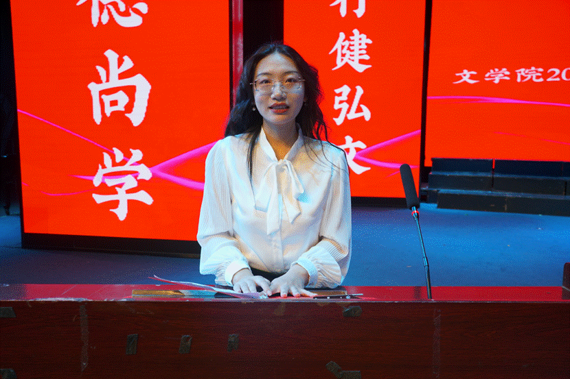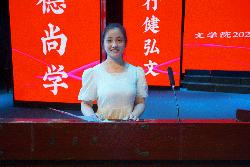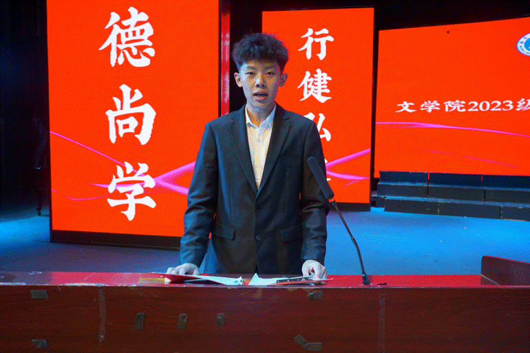 第二项由2023级本科生代表毕乃元同学发言。她追溯了过去的努力,今时的体验与欢悦,感谢入学时温暖亲切的老师、学长们的热情指引和帮助;呼吁同学们要在学习与实践中提升学习能力与专业竞争力,在使命与担当中走好人生之路,在理想与困境中书写生命的诗篇;宣誓要将自己的努力融入到国家发展的大潮中,立大志,明大德,成大才,担大任,让青春在不懈的奋斗中绽放绚丽之花。