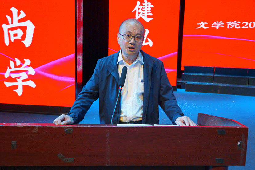第四项由在校生代表第十五届学生会主席何睿同学发言,他对来自五湖四海的新同学表示热烈的欢迎,向新同学们分享了三年来自己在校的感受,提醒新同学要在学习生活中找到属于自己的方向,明确未来的目标,要在追求高远、积极进取中提升人生境界,做心中有梦眼里有光的青年。
