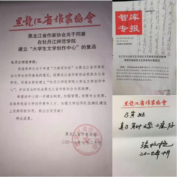 2018年,在韩乃寅先生的倡导和筹划下,黑龙江省作家协会、牡丹江师范学院大学生文学创作中心在我校成立,使我校成为全省大学生作家人才培养的基地。“乃寅写作班”的创意写作人才培养模式在全省高校推广,分别在黑龙江农业经济职业学院、黑龙江工业学院等高校建立“乃寅写作班”分部,推广创意写作人才培养经验。同时,写作班的成功做法,也为各级各类学校的写作教学提供了成功范例。大连大学来我校调研、考察,借鉴创意写作人才培养经验。写作班师生到牡丹江市中学传授创意写作方法。并通过专题讲座、培养在职中学教师攻读专业硕士学位等途径,惠及牡丹江市周边的中小学。由“乃寅写作班”教学团队负责讲授的《创意写作与立体式教学》课程,已于2018年3月在“智慧树”在线教育平台开通,成为一种全社会共享的课程资源。