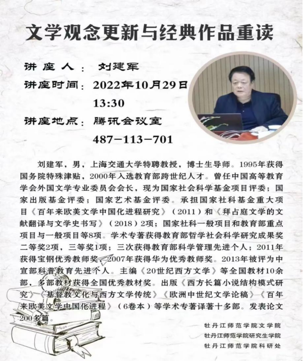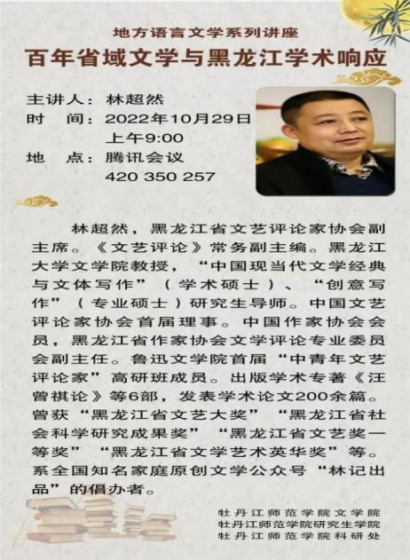 在党的二十大圆满结束之际,安博在线平台为营造良好的学术科研氛围,拓展研究生知识学习的深度和广度,将于10月29日举办两场讲座。上午9:00举行“地方语言文学系列讲座:百年省域文学与黑龙江学术响应”讲座,黑龙江省文艺评论家协会副主席林超然教授担任本次讲座的主讲人。下午13:30举行“文学观念更新与经典作品重读”讲座,上海交通大学特聘教授、博士生导师刘建军教授担任本次讲座的主讲人。