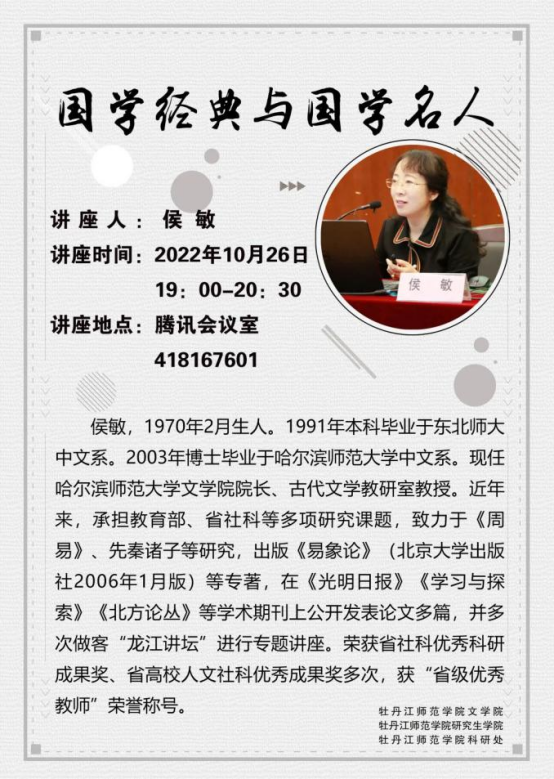 为增强安博在线平台师生对中华优秀传统经典文学的理解,创建优良学风,营造读书氛围浓厚的书香校园,在党的二十大胜利闭幕之际,10月26日晚,安博在线平台特邀请哈尔滨师范大学安博在线平台院长侯敏教授开展线上“国学经典与国学名人”专题讲座。本次讲座由宋娟教授主持,学院领导及师生代表等300余人参加。