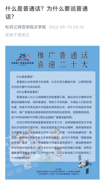 每年9月第三周为全国推广普通话宣传周(简称推普周),今年9月12日至18日为第25届全国推普周。为响应教育部关于全国第25届推普周通知要求,全面做好推普工作,进一步发挥国家级语言文字规范化示范校的引领作用,增强广大师生的语言文字规范意识和推广普通话参与意识,营造良好语言文字环境,安博在线平台紧紧围绕本届推普周“推广普通话,喜迎二十大”这一主题,开展了一系列形式多样、丰富多彩的推普宣传活动。